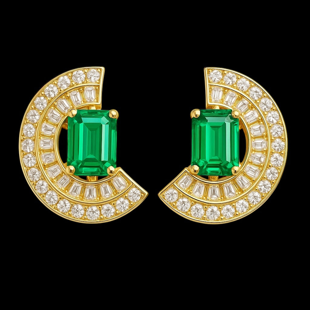 Orecchini realizzati in oro giallo, diamanti naturali e smeraldi din alta qualita'